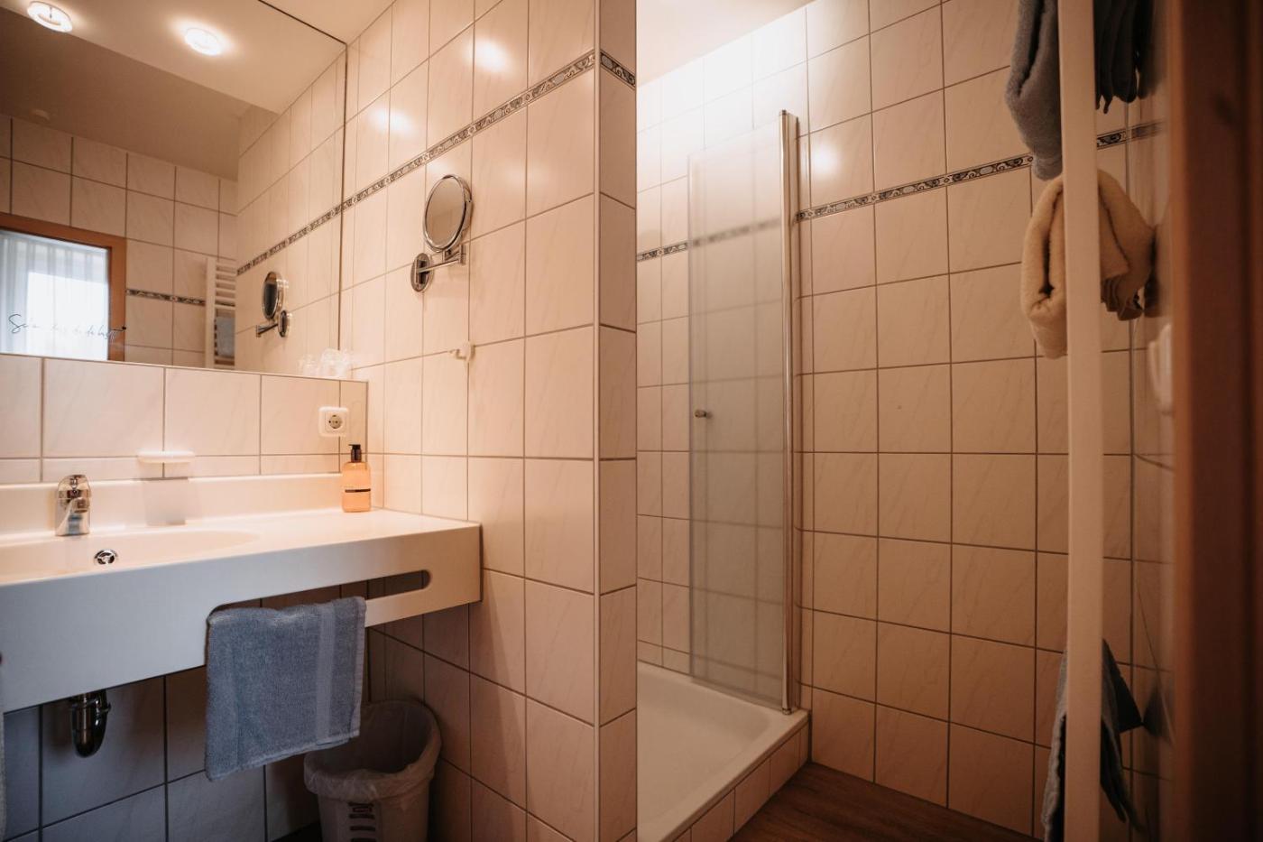 Doppelzimmer mit Balkon. The spacious double room provides a wardrobe, a safe deposit box, a terrace with garden views as well as a private bathroom featuring a shower. The unit offers 2 beds.