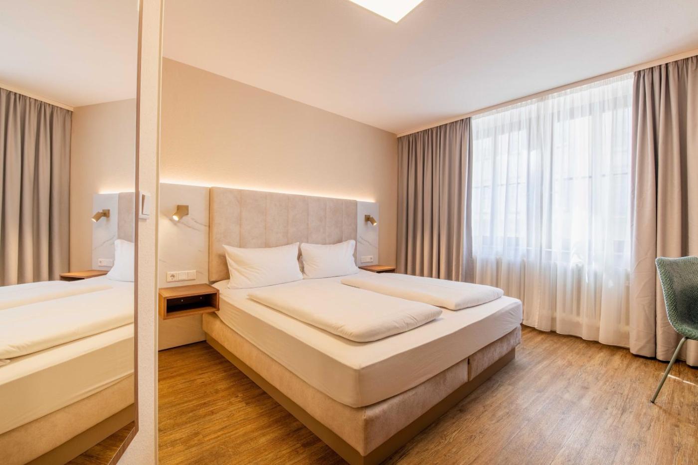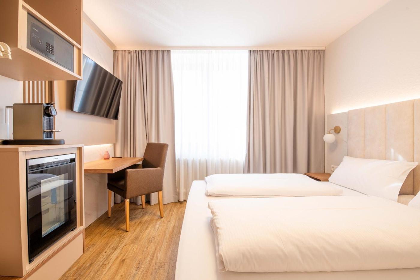Doppelzimmer. This double room was fully renovated and modernized in 2026. High-quality materials and a stylish designa pleasant atmosphere in the heart of Würzburg. Amenities include a flat-screen TV, refrigerator, safe, and a coffee machine with a hot water function. A desk with power outlets, USB and USB-C ports, and free Wi-Fi are also provided. ;
